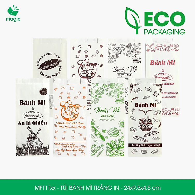 Combo 100 Túi bánh mì Trắng 24x9.5x4.5 cm - In sẵn họa tiết nhiều mẫu - Bao bánh mì Túi giấy thực phẩm an toàn