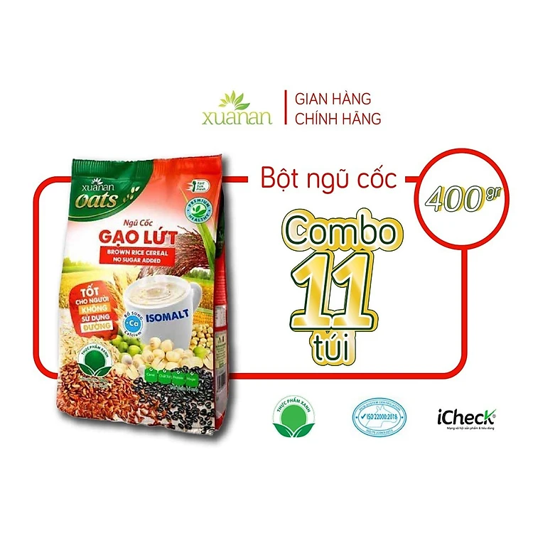 Combo 11 Túi Ngũ Cốc Gạo Lứt No Sugar Xuân An [đường ăn kiêng] 400G {25g*16 gói}(Tặng Kèm 11 Túi Yến Mạch 150G)