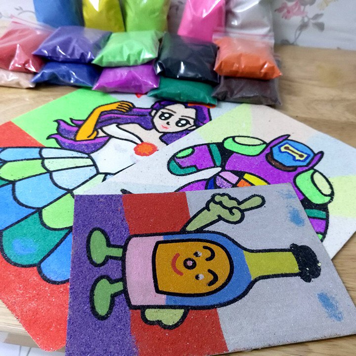 - Chất liệu: Cát màu. Cát được nhuộm màu theo quy trình của nhà sản xuất, màu an toàn, không gây kích ứng da khi tiếp xúc.