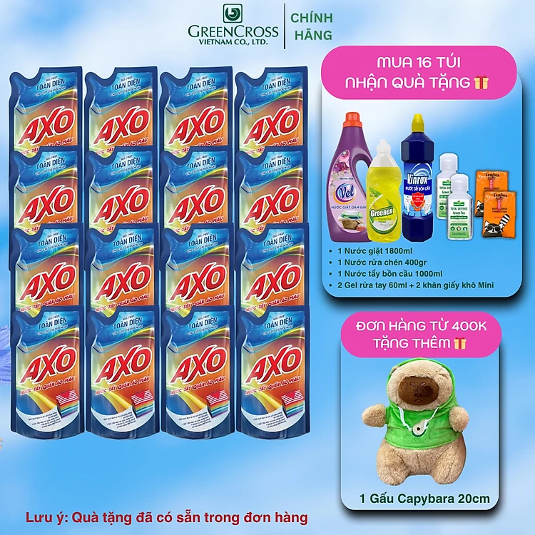 Combo 16 túi Nước tẩy quần áo màu AXO đánh bay vết bẩn 400ml Hương Tươi Mát