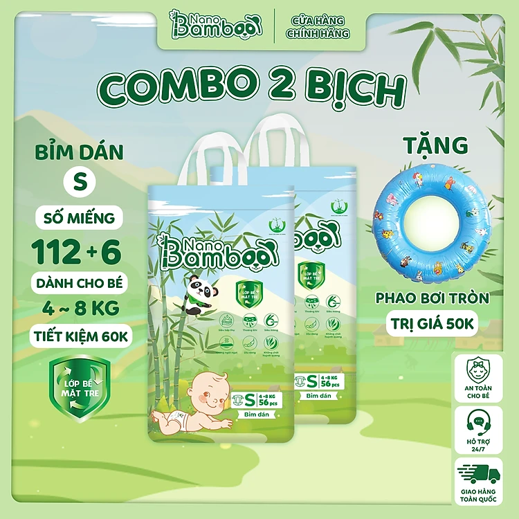 COMBO 2 Bịch tã/bỉm DÁN Nano Bamboo sợi tre M/L/XL/XXL/XXXL (112+6 Miếng) tiết kiệm 60k kèm quà tặng