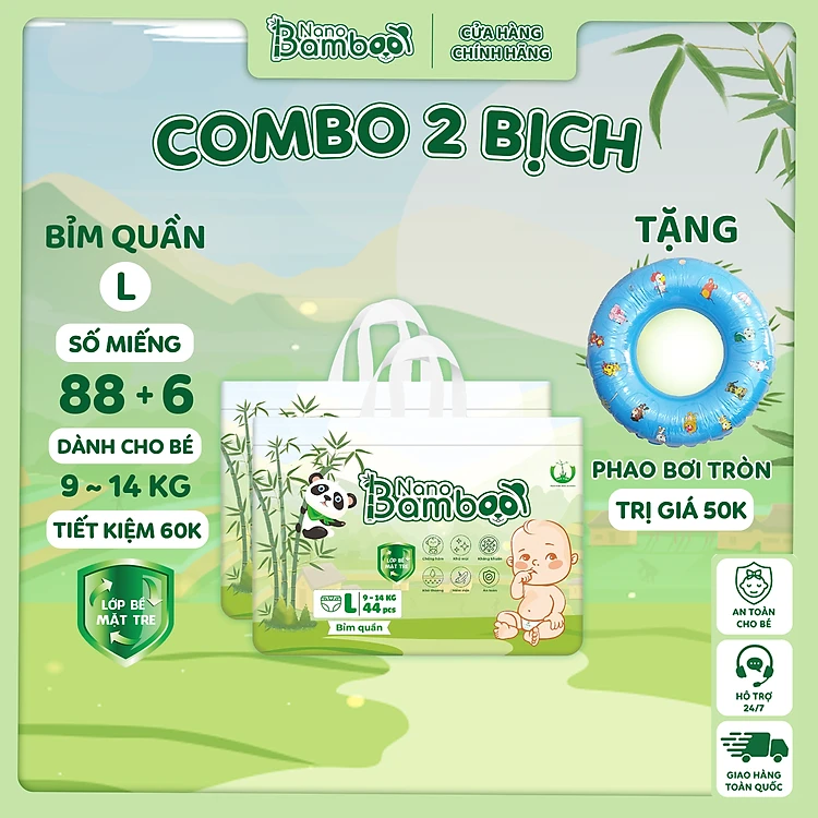COMBO 2 Bịch tã/bỉm QUẦN Nano Bamboo sợi tre M/L/XL/XXL/XXXL (88+6 Miếng) tiết kiệm 60k kèm quà tặng