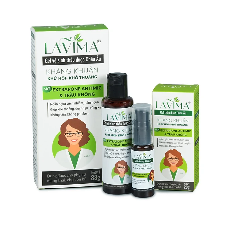 - Bộ Gel rửa và Gel bôi phụ khoa Lavima có thành phần 8 loại "kháng sinh tự nhiên", gồm hỗn hợp thảo dược Extrapone Antimic nhập từ Đức chứa 7 loài thảo dược: Cỏ xạ hương (Thyme), Xô Thơm (Sage), Sầu đông, Cỏ Hương Lau, Chanh, Hương Thảo, Lô hội và dịch chiết Lá Trầu Không nhập từ Tây Ban Nha.