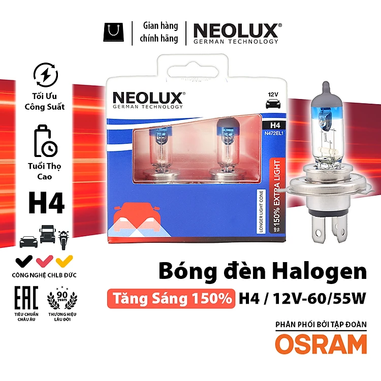 Combo 2 Bóng Đèn Halogen Tăng Sáng 150% OSRAM NEOLUX Dùng Cho Xe Ô Tô Xe Máy Chân H4 H7 - Nhập Khẩu Chính Hãng