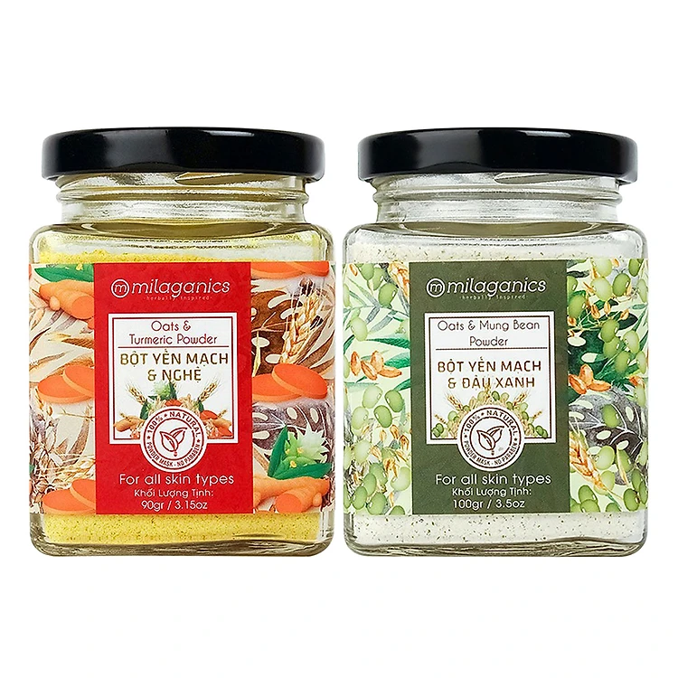 Combo 2 Bột Hũ Milaganics Dưỡng Da: Yến Mạch Nghệ (90g) + Yến Mạch Đậu Xanh (100g) - Bộ sản phẩm có chiết xuất từ bột thiên nhiên, nên an toàn cho người sử dụng. Sản phẩm thích hợp dùng làm quà tặng cho người thân, bạn bè, hoặc tự tặng cho chính mình.