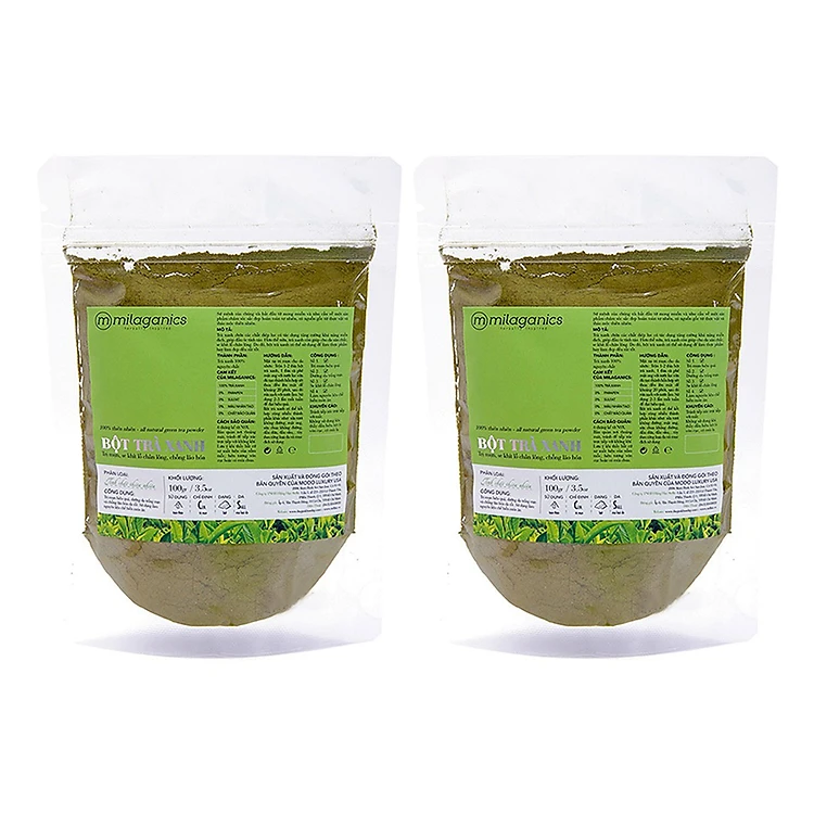 - Combo 2 Bột Trà Xanh Nguyên Chất Milaganics (100g / Gói) với hàm lượng chất chống oxy hóa và kháng khuẩn, bột trà xanh được xem như “thần dược” chăm sóc da của phái đẹp. Được sản xuất từ những lá trà xanh chất lượng nhất từ các vùng trồng trà xanh nổi tiếng của Việt Nam, sản phẩm Bột Trà Xanh Milaganics là lựa chọn hoàn hảo, mang đến cho bạn làn da tươi mới, đẩy lùi nỗi lo về mụn và sẹo mụn, hạn chế bóng nhờn đến mức tối đa.