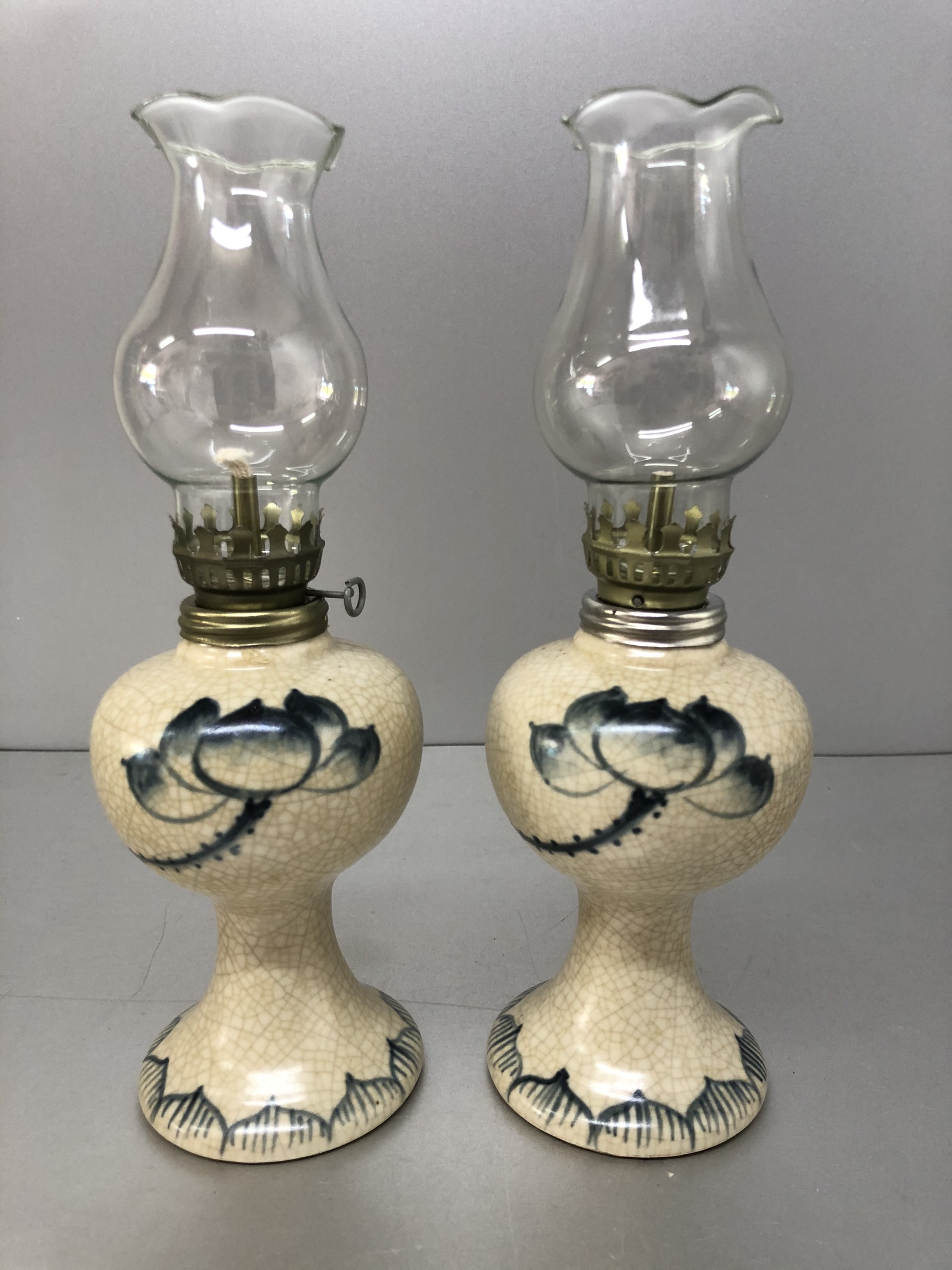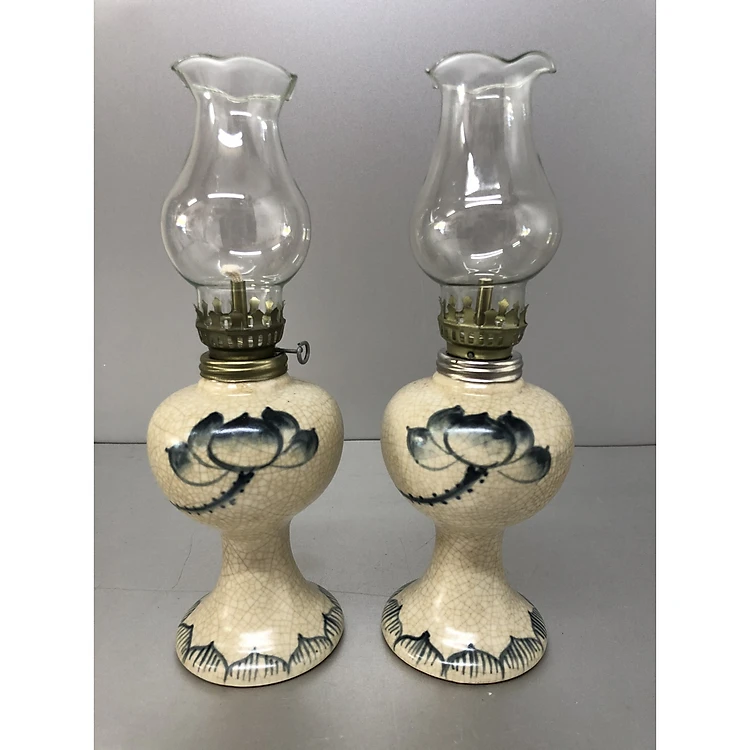 Combo 2 Đèn thờ đốt dầu men rạn vẽ hoa sen