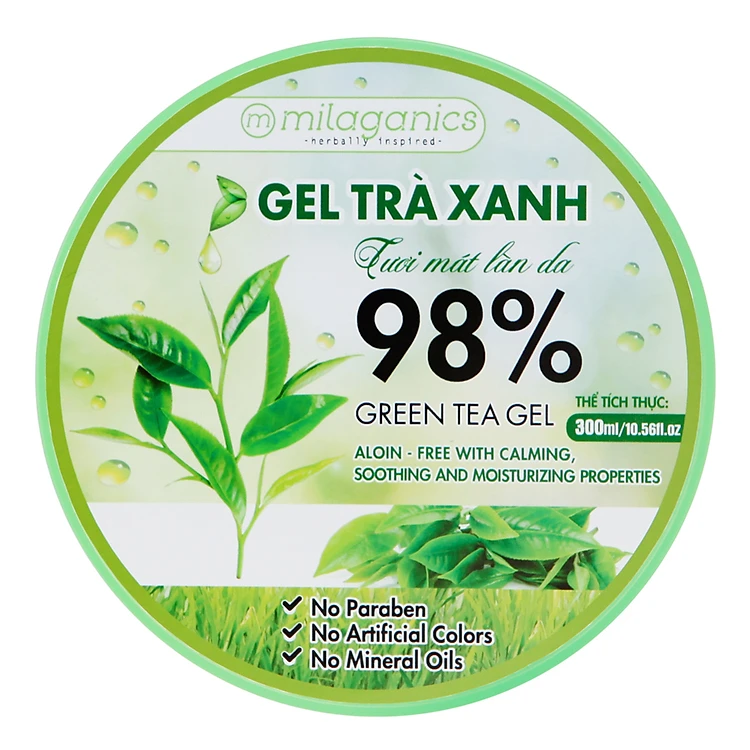 • Combo 2 Gel Trà Xanh Tươi Mát Làn Da Milaganics là sự kết hợp hài hòa giữa nước nha đam tươi mát và tinh dầu từ lá trà xanh giúp chữa lành các thương tổn do tác động của ánh nắng mặt trời, làm mềm mượt da đồng thời giúp se nhỏ lỗ chân lông, cho làn da thêm mịn màng, trắng sáng.