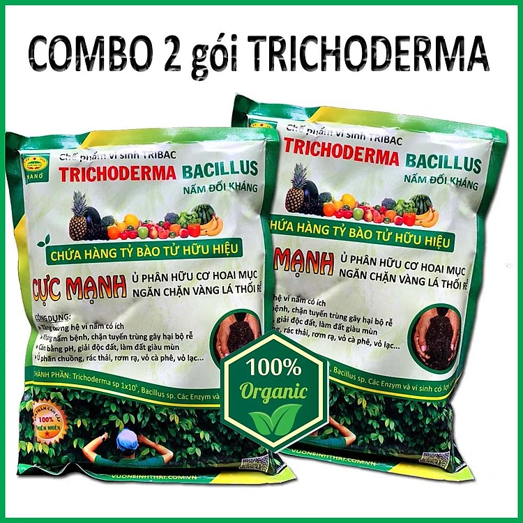 Combo 2 gói Chế phẩm vi sinh Trichoderma TRIBAC 1kg. Ủ phân rác bã hữu cơ hoai mục không mùi hôi. Đối kháng nấm hại, khống chế thối rễ. HSD: 2 năm