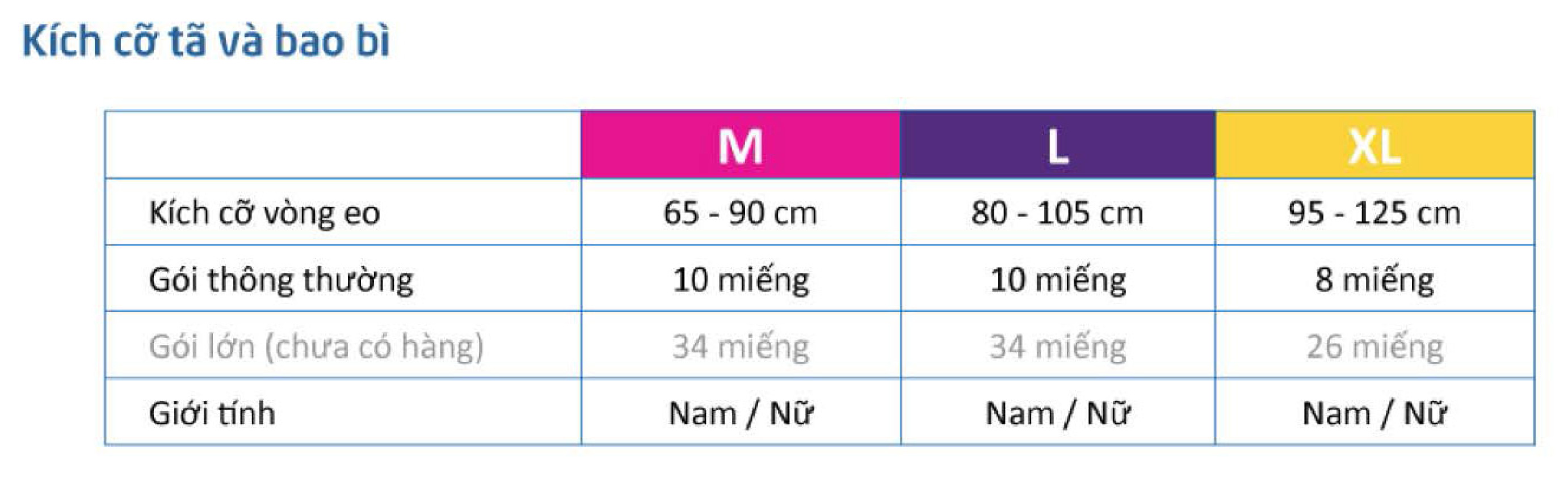 - Size XL: Gói 8 miếng dành cho người lớn có vòng eo từ 95 - 125 cm
