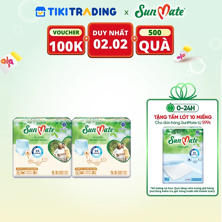 Combo 2 Gói Tã Quần Người Lớn Sunmate Khô Thoáng M8 (8 Miếng/ Gói)