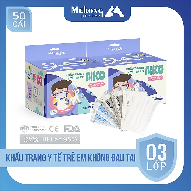 Combo 2 hộp Khẩu trang y tế trẻ em Miko cao cấp, có dây đeo mềm không đau tai