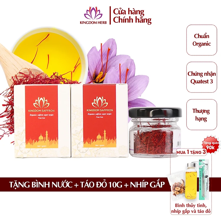 Combo 2 hộp (hộp/1gr) saffron Kingdom Herb, nhụy hoa nghệ tây Iran chính hãng super negin thượng hạng (tặng táo đỏ Tân Cương 10g, bình thủy tinh và nhíp gắp saffron)