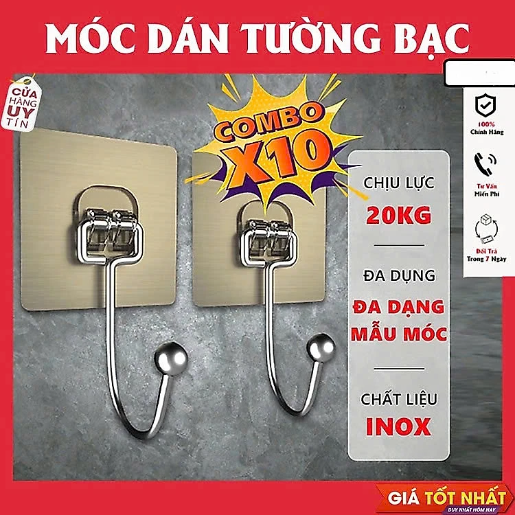 COMBO 10 Móc Dán Tường Inox 304 Loại 1 Chân Chịu Lực Đến 20kg Kèm Miếng Dán Tráng Bạc Siêu Dính, Móc Dán Chịu Lực Loại Tốt