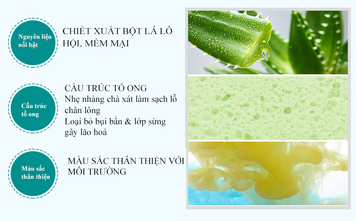 - Mút rửa mặt lô hội có chiết xuât từ bột lá lô hội mang lại sự mềm mại cho làn da của bạn.