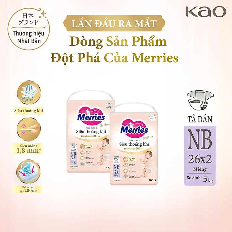 Combo 2 Tã Dán Merries Siêu Thoáng Khí Đủ Size NB62/S56/M48