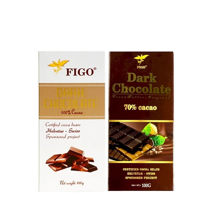 Chocolate Figo có tất cả 7 vị : Đắng 100%, 85%, 70%, Sữa, Hạnh nhân, Hạt điều, Dừa.
