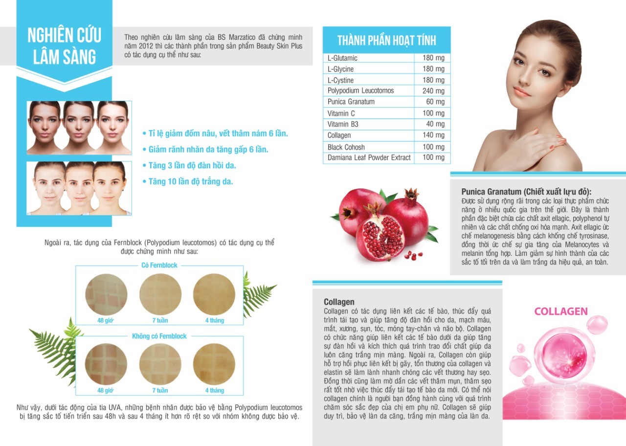 Những thành phần chính: Glutathione, Collagen, Tinh chất lựu đỏ, Chiết xuất dương xỉ Trung Mỹ, Vitamin B & C, Thảo mộc thiên nhiên...