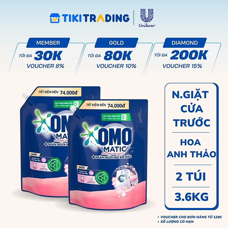 Combo 2 Túi Nước Giặt Omo Matic Cho Máy Giặt Cửa Trước Hương Hoa Anh Thảo Ngăn Mùi Ẩm Mốc 3.6KG