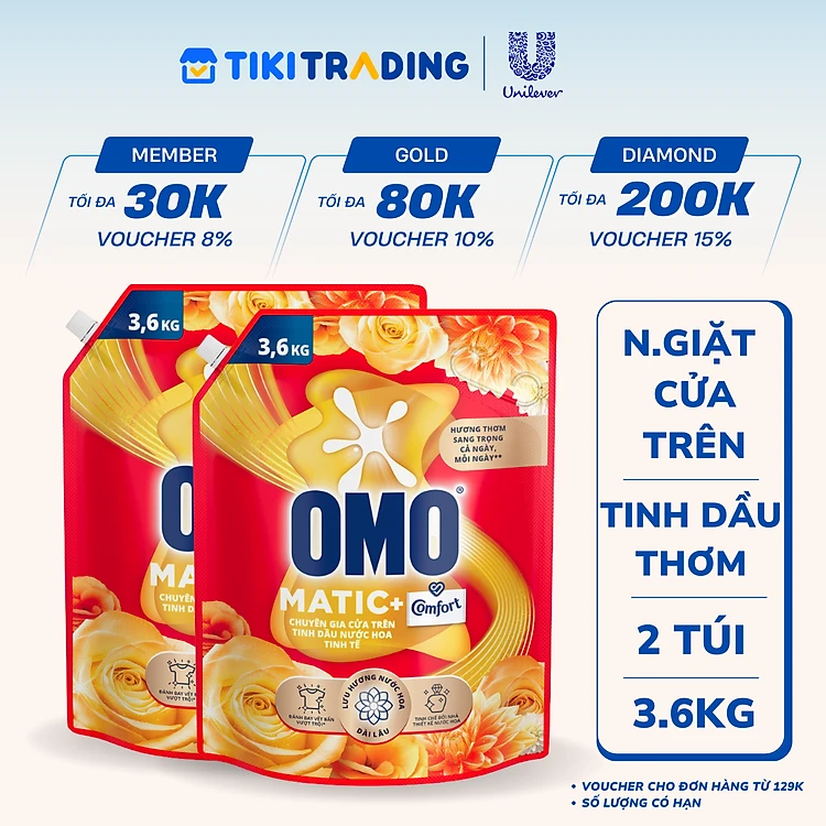 Combo 2 Túi Nước Giặt Omo Matic Hương Tinh Dầu Thơm Cho Máy Giặt Cửa Trên 3.6KG