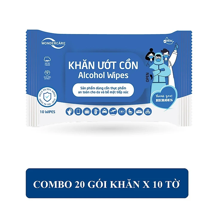 Khăn ướt có chứa cồn giúp kháng khuẩn đến 99,9 % làm sạch tay , các vật dụng tiếp xức trực tiếp phù hợp cho học sinh, văn phòng, đi du lịch, dã ngoại,