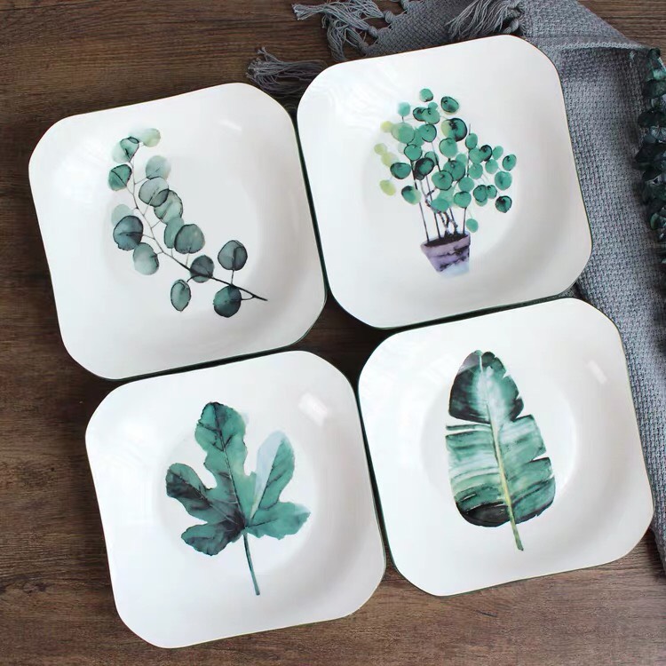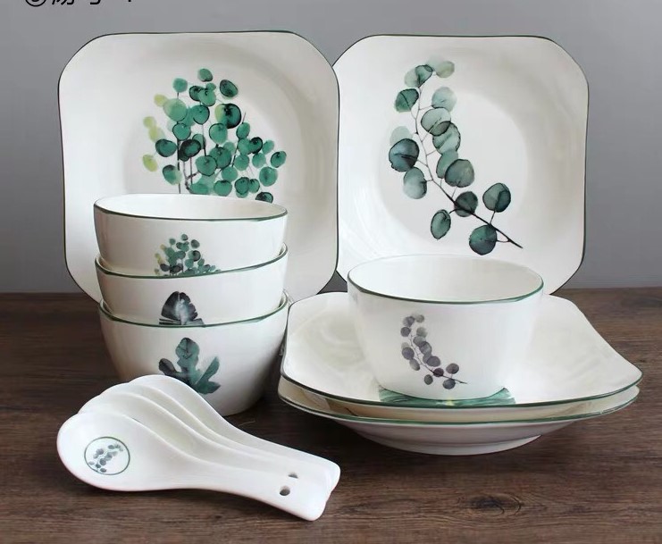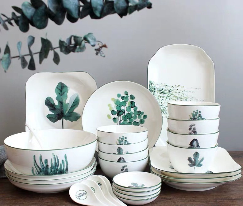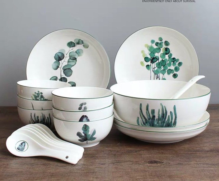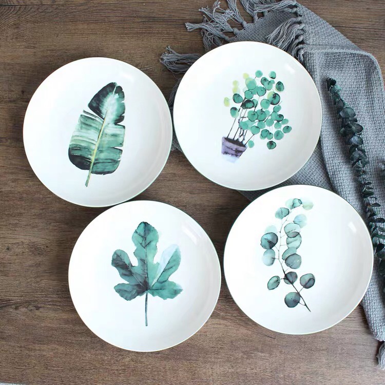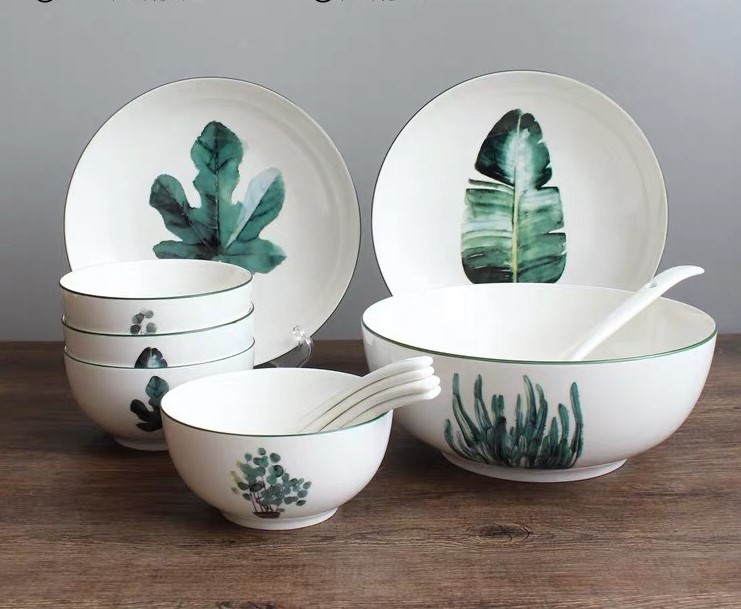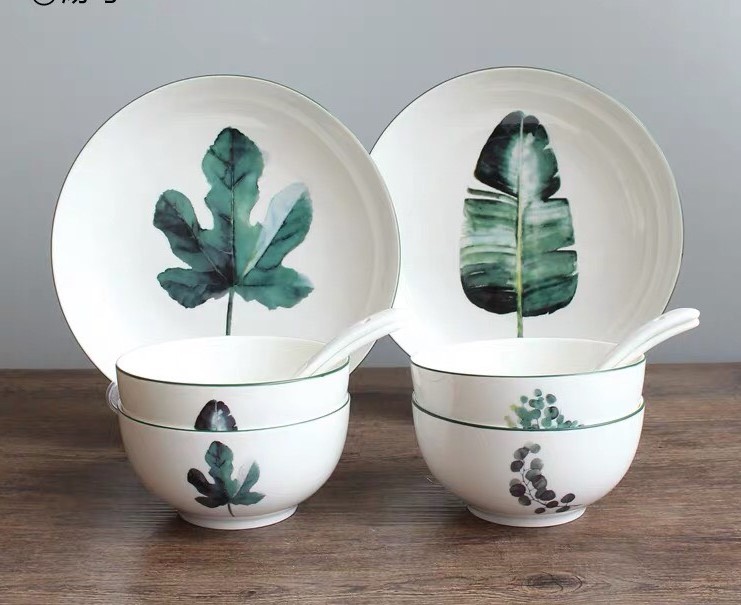 Bộ bát đĩa với hoa văn đơn giản hiện đại hình chiếc lá. Men sáng bóng loáng.
