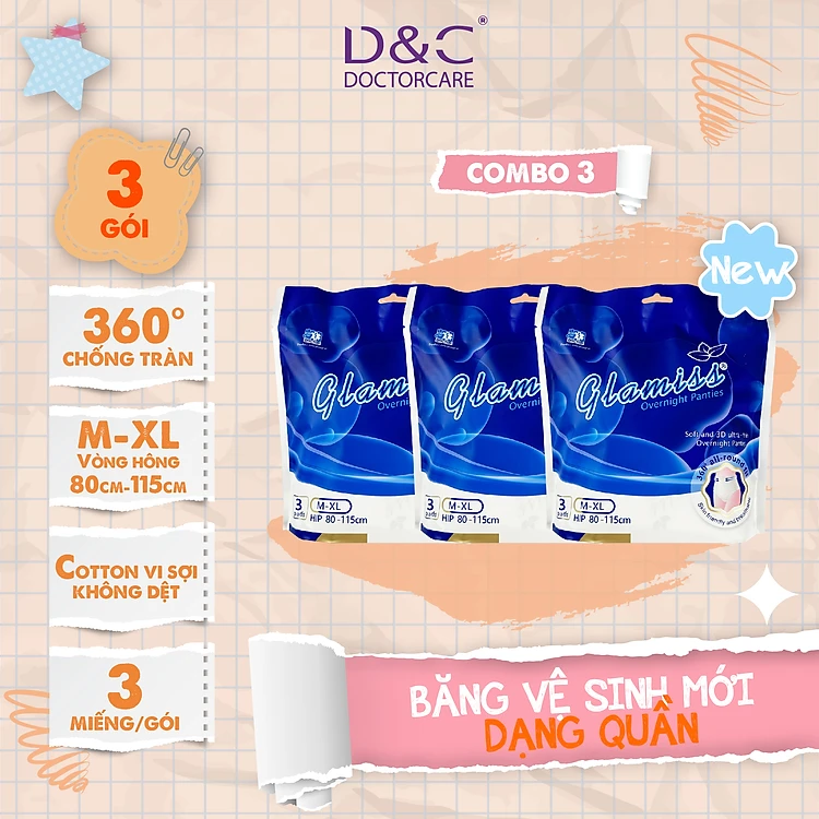 Combo 3 gói băng vệ sinh dạng quần Glamiss ban đêm size M-XL siêu mỏng, bề mặt 2 lớp siêu mềm mịn