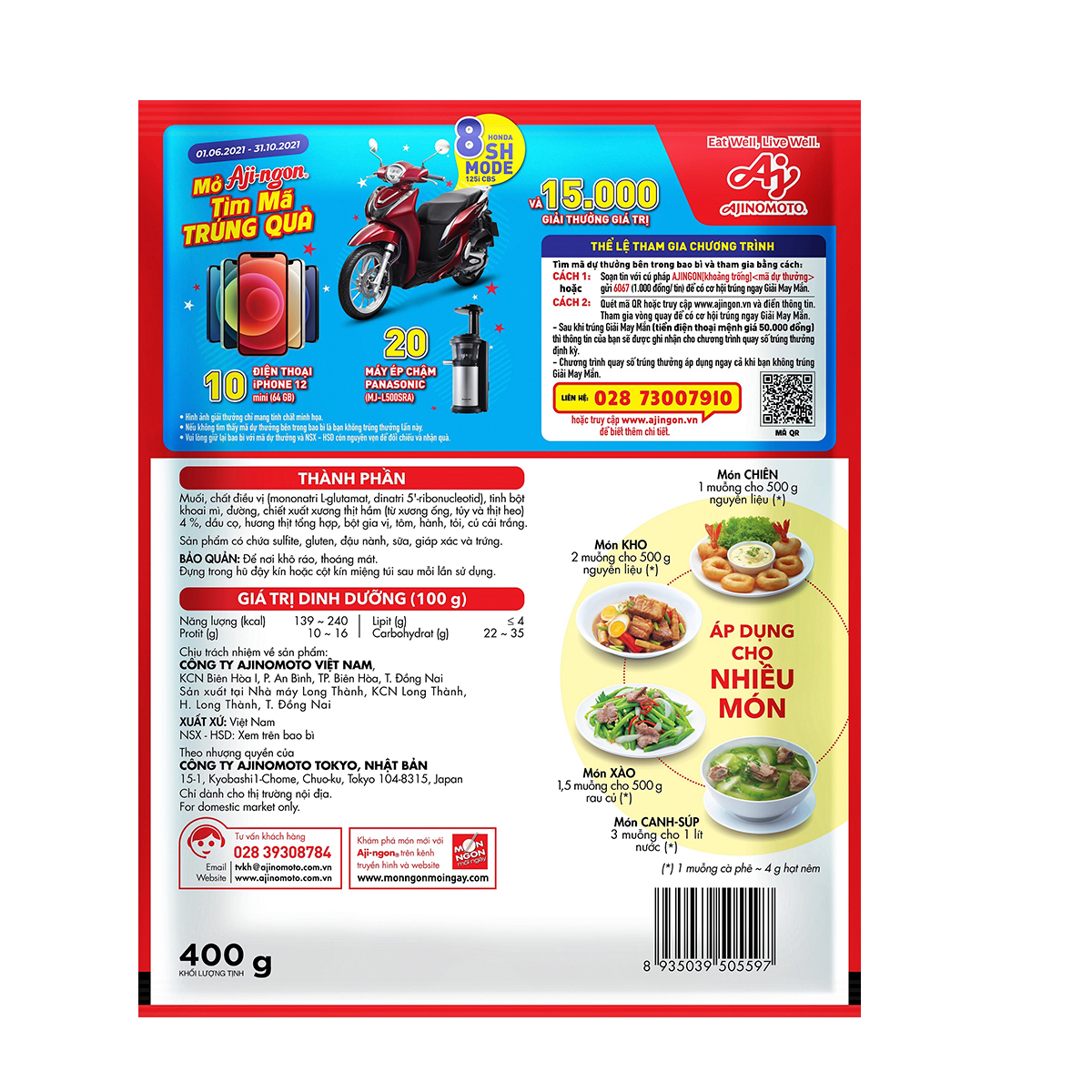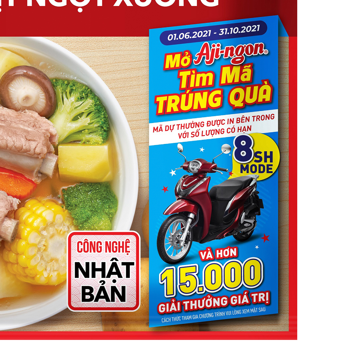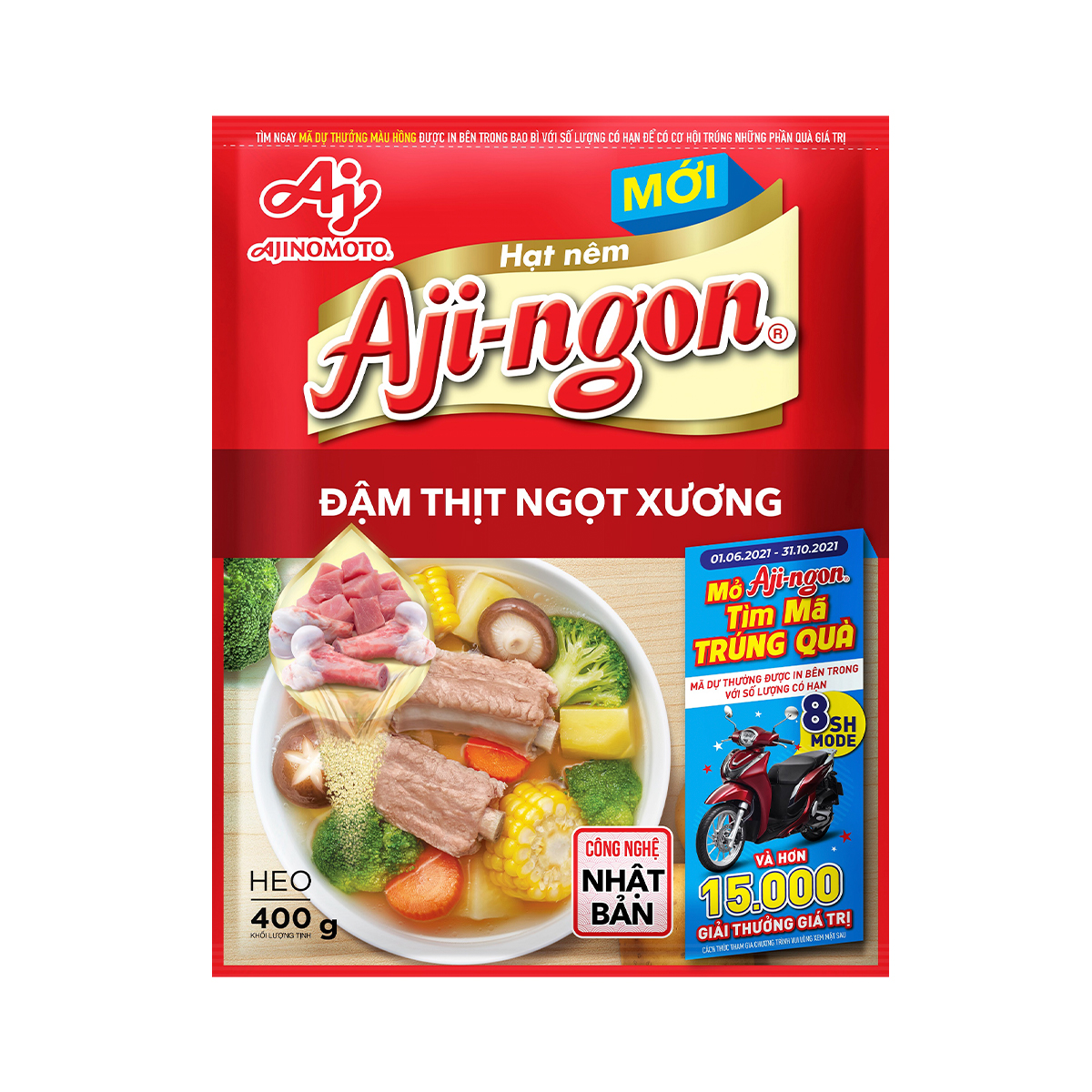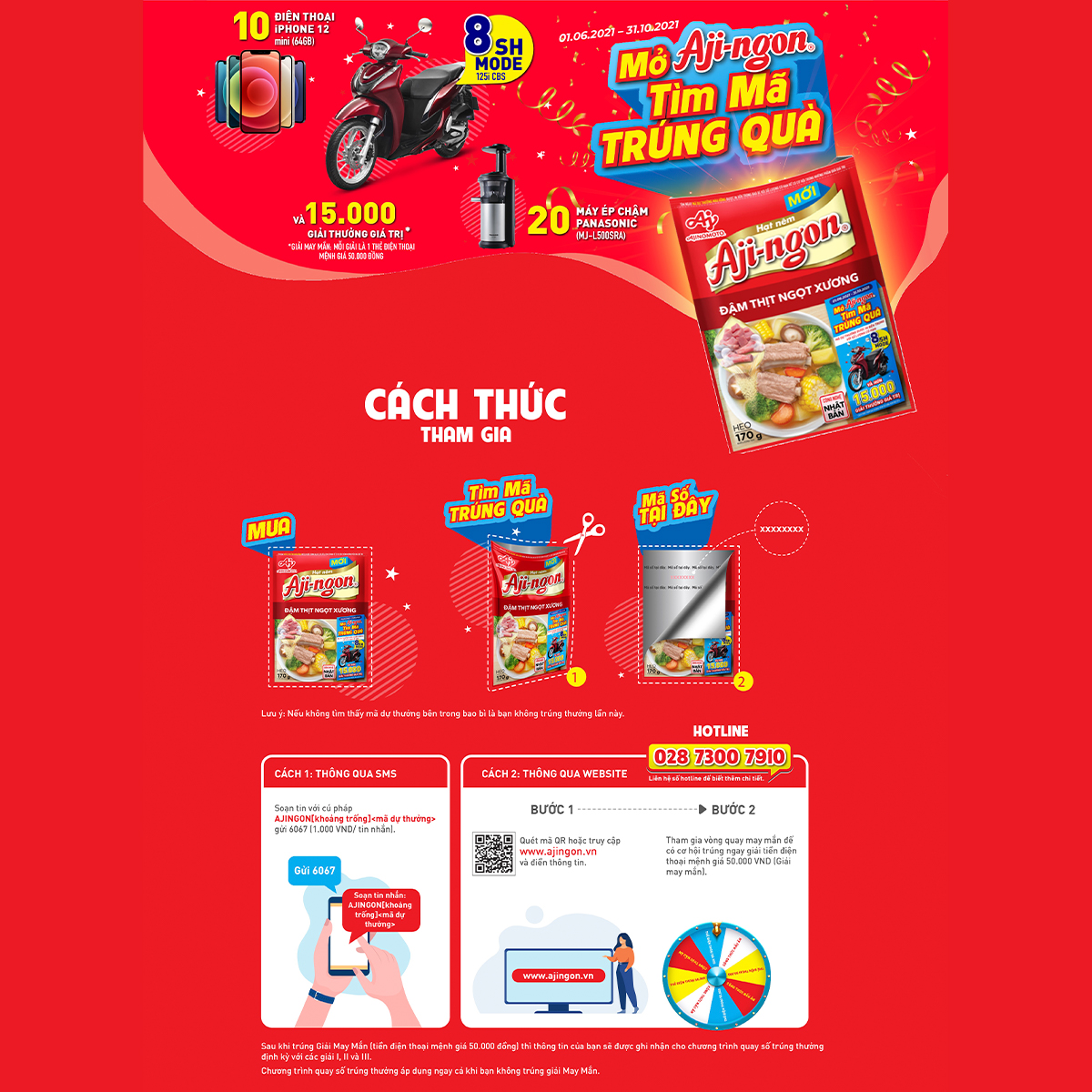 Từ ngày 01/06/2021 đến ngày 31/10/2021, khi MỞ gói Aji-ngon Heo bất kỳ, bạn sẽ có cơ hội TÌM được 01 mã khuyến mãi với cơ hội TRÚNG các giải thưởng giá trị: 08 chiếc xe SH Mode, 10 chiếc điện thoại iPhone 12, 20 chiếc máy ép chậm Panasonic và 15,000 thẻ cào trị giá 50,000đ. Để tham gia, hãy tìm ngay mã dự thưởng có thể có bên trong bao bì và làm theo hướng dẫn bên dưới! Mua Aji-ngon ngay hôm nay để nhận quà hay nào!