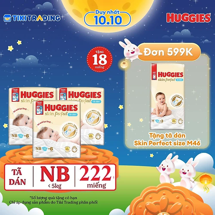 Combo 3 gói Tã/bỉm dán sơ sinh Huggies Skin Perfect NB 70+4 miếng với 2 vùng thấm giảm kích ứng da