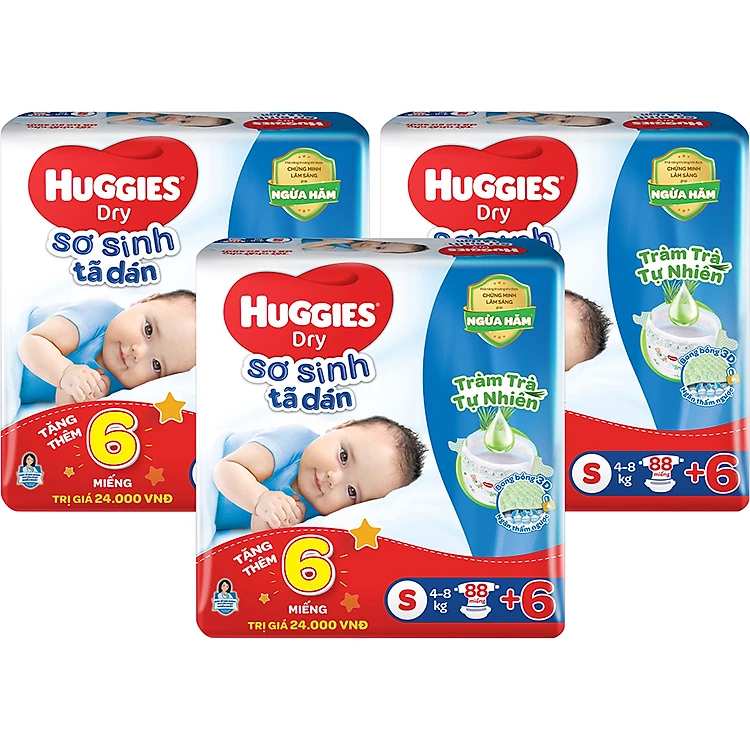 Combo 3 Gói Tã Dán Sơ Sinh Huggies S88 (4kg-8kg) - Gói 88 Miếng - Tặng 6 miếng