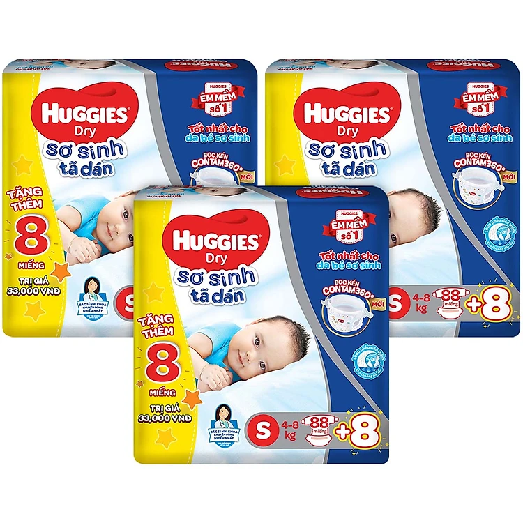 Combo 3 Gói Tã Dán Sơ Sinh Huggies S88 (4kg-8kg) - Gói 88 Miếng - Tặng 8 miếng