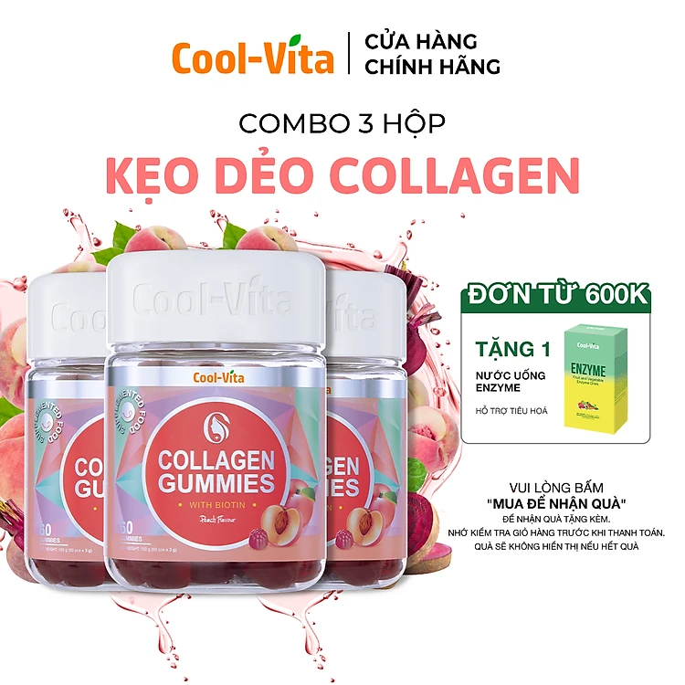 Combo 3 Hộp Kẹo Dẻo Collagen Hỗ Trợ Trẻ Hóa Sáng Da - Cải Thiện Sức Khỏe Tóc Móng Vị Đào Kết Hợp Biotin, Vitamin C & Vitamin E Coolvita (60 viên x 3g)/hộp