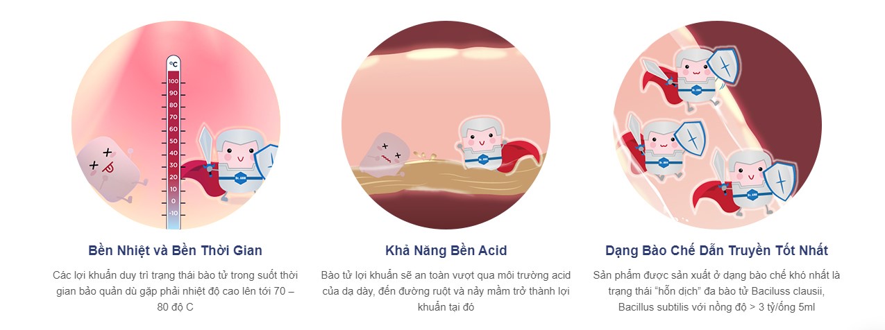 - Bên cạnh việc ức chế/tiêu diệt, đào thải hại khuẩn, hình thành màng sinh học bảo vệ niêm mạc ruột/đại tràng, giúp giảm nhanh các triệu chứng rối loạn tiêu hóa của người bệnh, các lợi khuẩn được bổ sung còn tăng tổng hợp các vitamin, các enzyme, giúp người bệnh ăn ngon, tiêu hóa tốt, sức khỏe nhanh chóng hồi phục. Đặc biệt lợi khuẩn Bacillus subtilis kích thích cơ thể tổng hợp ra kháng thể IgA ngay trên bề mặt niêm mạc ruột/đại tràng, có tác dụng ức chế đối với hại khuẩn xâm nhập, giúp các vùng tổn thương lành nhanh hơn.