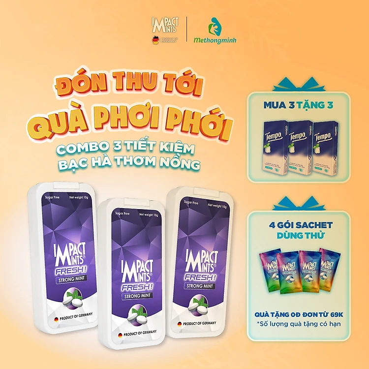 Combo 3 Kẹo Không Đường Bạc Hà IMPACT MINTS FRESH 10g (Tặng kèm 3 gói khăn giấy tempo)