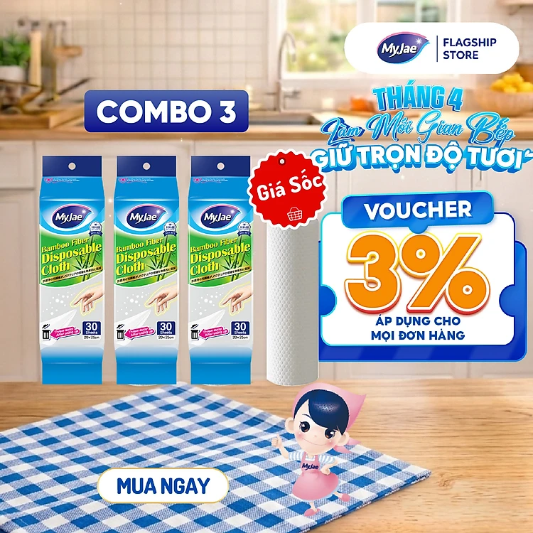 Combo 3 Khăn lau sợi tre MyJae lau chùi tiện lợi, đánh bay dầu mỡ 20cm x 25cm (30 Tờ/Bịch)
