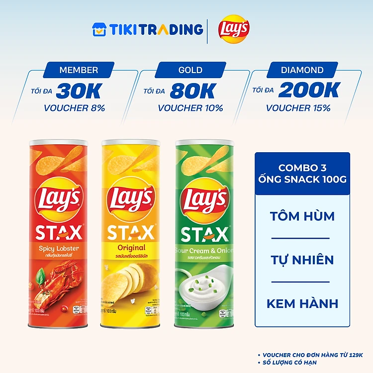 Combo 3 Lay's Stax 100gr (Tự nhiên, Tôm hùm nướng ngũ vị, Kem chua hành)