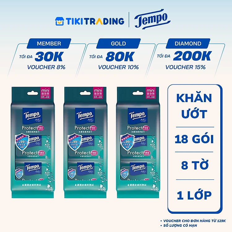 Combo 3 Lốc Khăn Ướt Mini Tempo Protect Ngăn Ngừa Vi Khuẩn (Lốc 6 Gói)