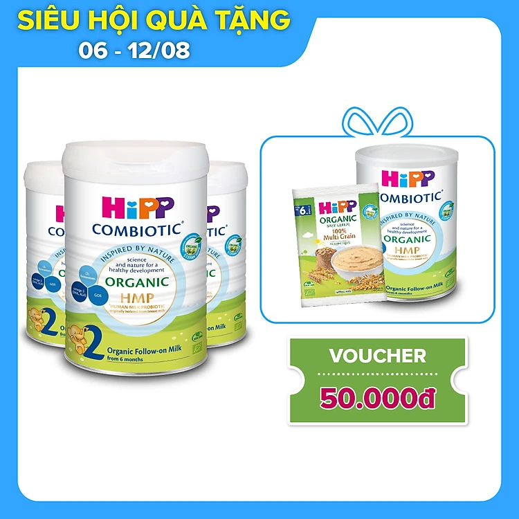 Combo 3 lon sữa bột dinh dưỡng công thức HiPP 2 Organic Combiotic chất lượng hữu cơ tự nhiên an toàn, bổ sung Omega 3 (DHA & ALA) dành cho trẻ từ 6 đến 12 tháng tuổi (3 lon x 800g)