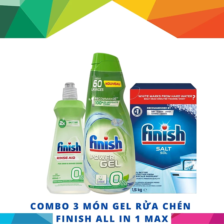 COMBO 3 món Finish Chai 900ml Gel Finish All in 1 Max + Hộp 1,5Kg muối + Chai 400ml nước bóng Finish dành cho máy