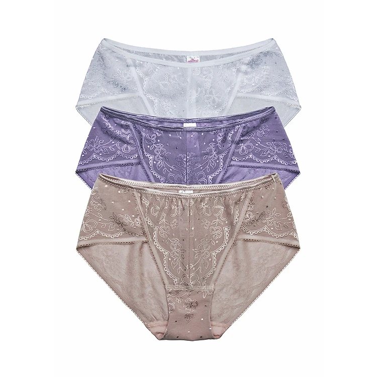 Combo 3 Quần Lót Nữ Gấm Miley FLG0500-1000-0200 cung cấp cho bạn 3 chiếc quần lót được thiết kế mới lạ với những đường cắt xẻ và viền ren tinh tế. Tùy sở thích mà bạn có thể chọn cho mình tông màu: be thanh lịch, tím nữ tính hoặc trắng thuần khiết khi mặc. Bề mặt quần thêu họa tiết đẹp mắt càng tô điểm vẻ dịu dàng cho chị em phụ nữ.