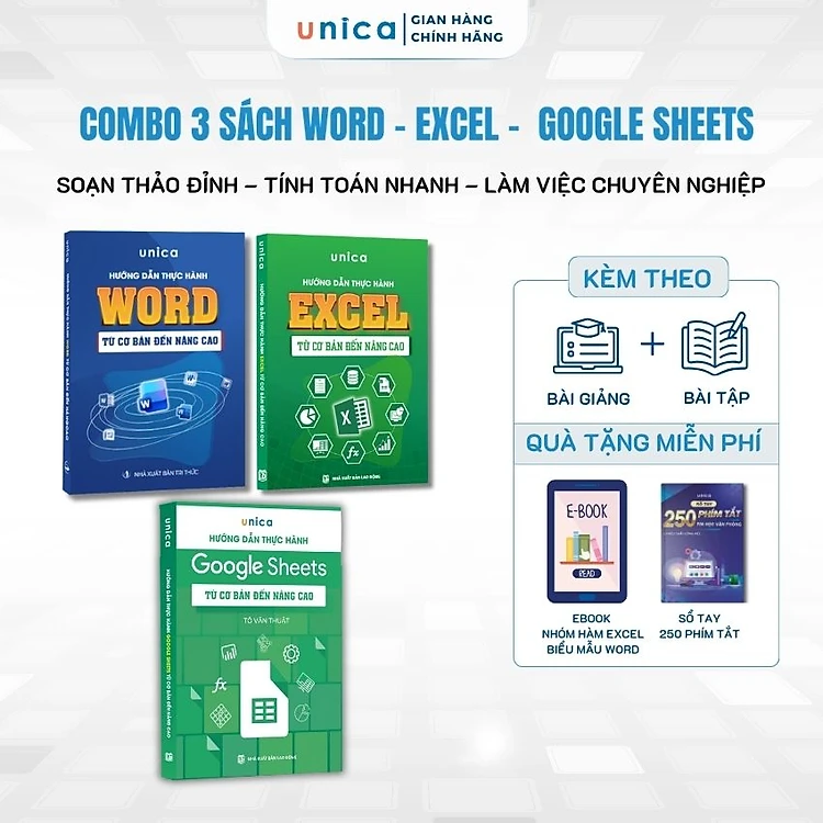 Combo 3 Sách Word - Excel - Google Sheets Unica hướng dẫn thực hành tin học văn phòng kèm video bài giảng