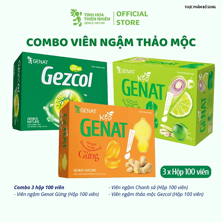 Combo 3 sản phẩm - Kẹo thảo mộc Gezcol, Genat Gừng, chanh sả (Hộp 100 viên) - Genat - Tinh Hoa Thiên Nhiên