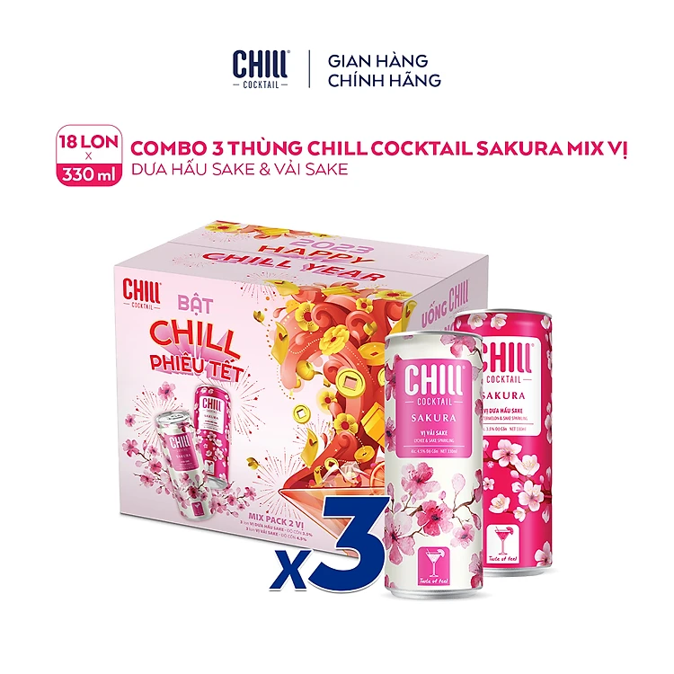 Combo 3 Thùng 6 lon Chill Cocktail Sakura mix vị Vải Sake & Dưa Hấu Sake (18 lon x 330ml/lon)