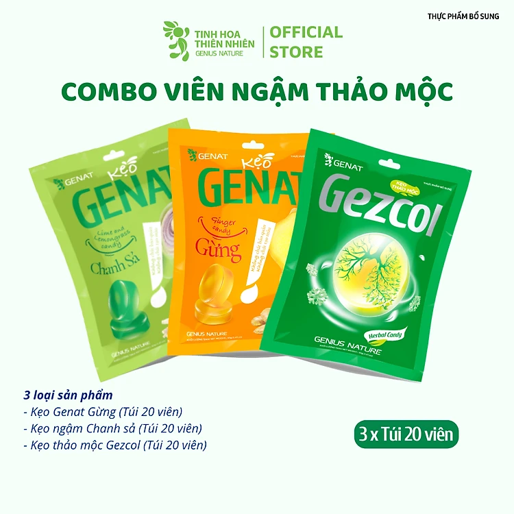 Combo 3 túi 20 viên - Kẹo thảo mộc Gezcol - Kẹo Genat Gừng - Kẹo ngậm Chanh sả - Genat - Tinh hoa thiên nhiên