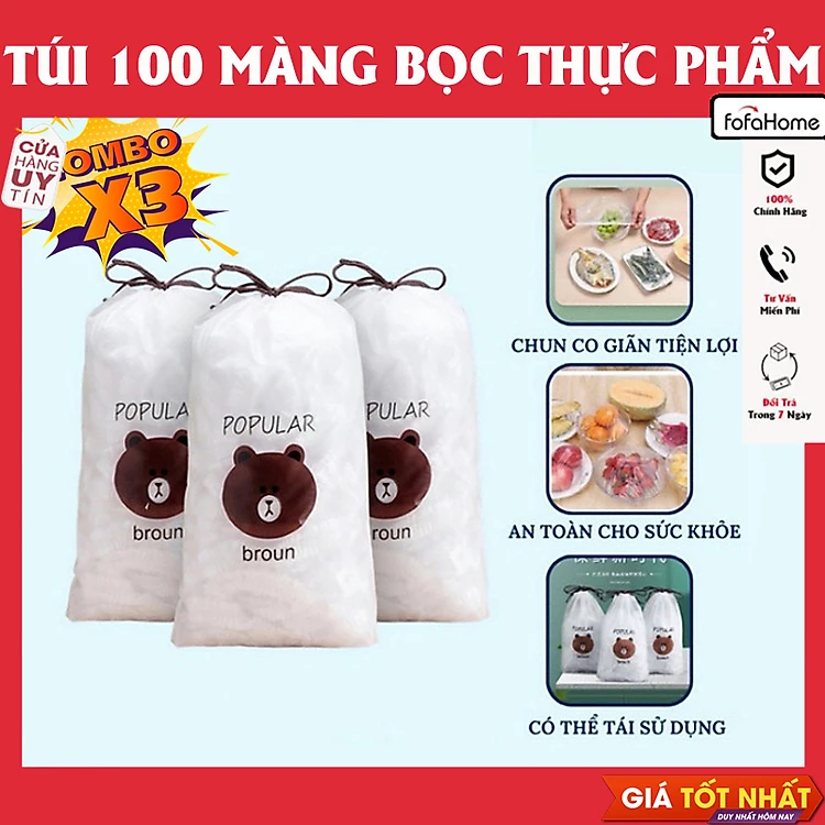 COMBO 3 Túi Màng Bọc Thực Phẩm Co Giãn Siêu Dai Có Chun Kèm Túi Gấu - Mũ Chùm Đầu Dùng 1 Lần Tiện Lợi