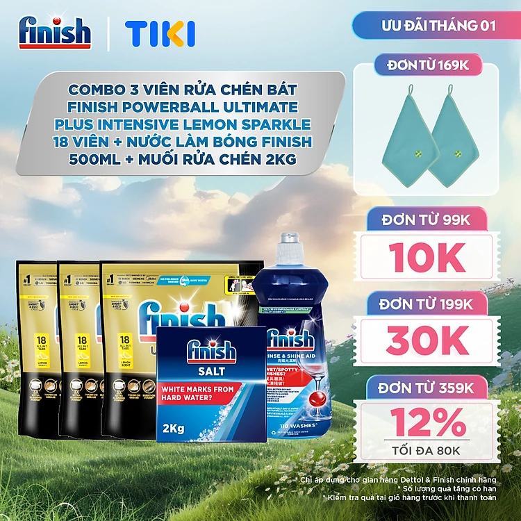 Combo 3 Viên rửa chén Finish Ultimate 18 viên + Nước làm bóng 500ml + Muối rửa chén 2kg