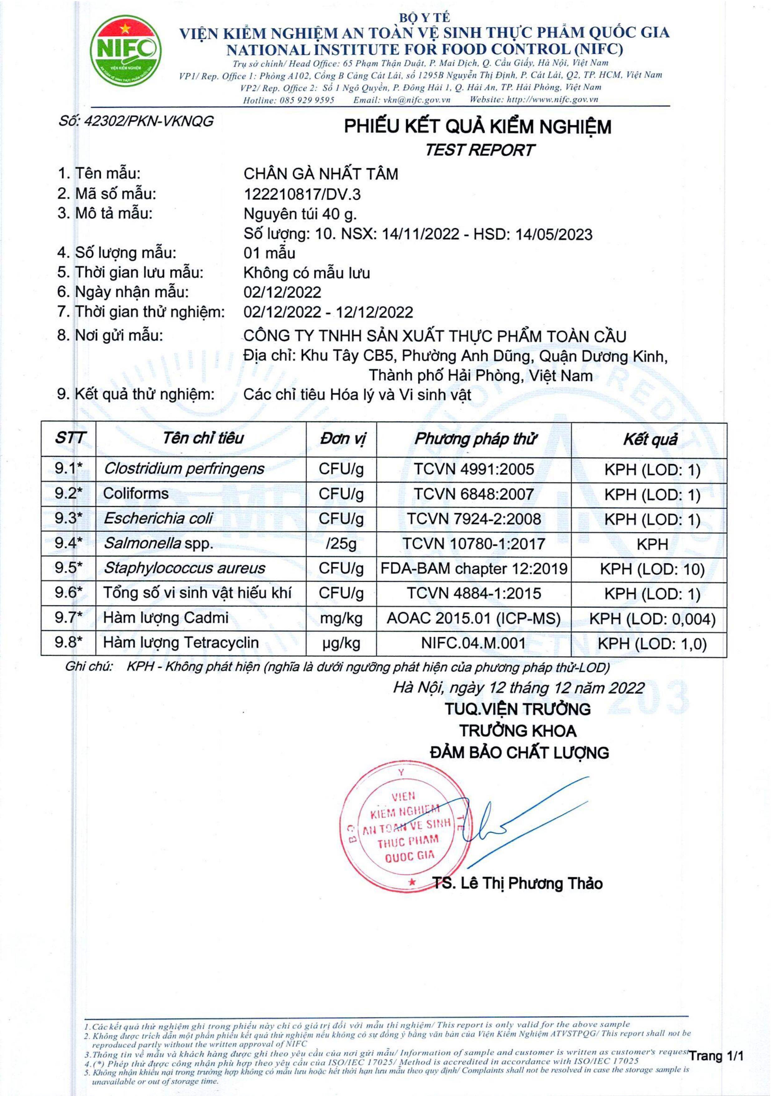 Sản phẩm đã được kiểm nghiệm phù hợp tiêu chuẩn an toàn vệ sinh thực phẩm