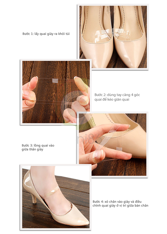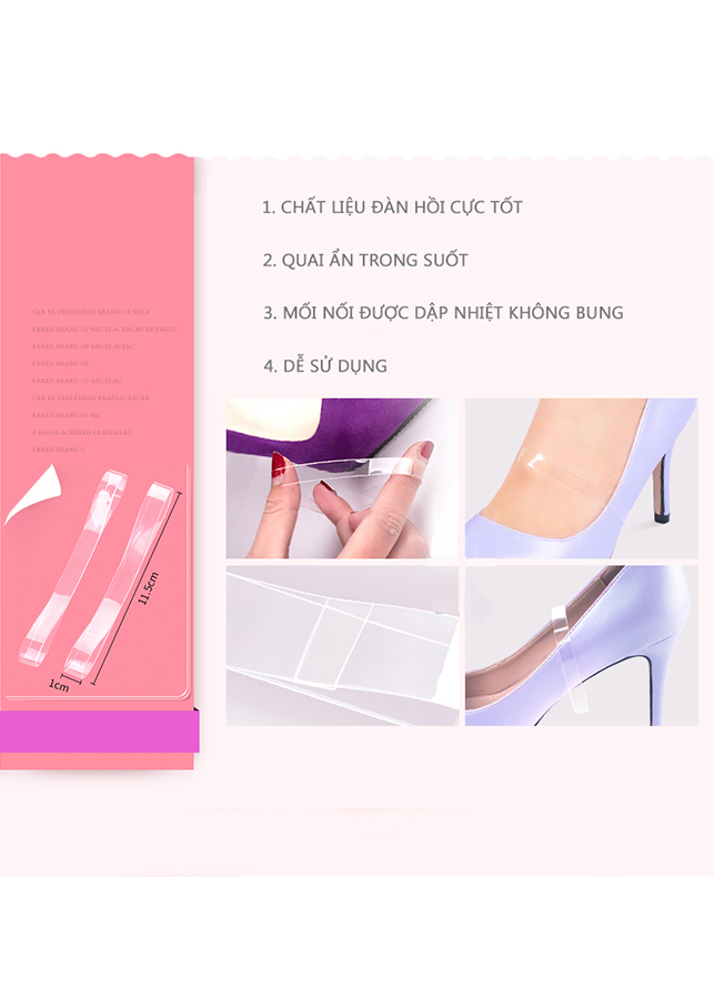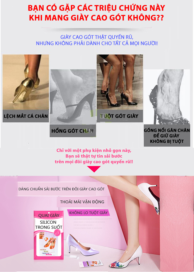 - Công dụng: quai giày silicon giúp giữ giày ôm vào chân, giày không bị tuột khỏi chân khi bàn chân phải nhấc lên cất bước khi mang giày cao gót. Quai giày màu trắng trong suốt nên như là một quai giày ẩn không làm ảnh hưởng đến thiết kế của đôi giày. Quai giày silicon có thể dùng cho hầu hết các mẫu giày nữ có gót cao: giày cao gót, giày búp bê, giày slip Lưu ý không dùng cho giày đế bằng sẽ làm đứt quai.