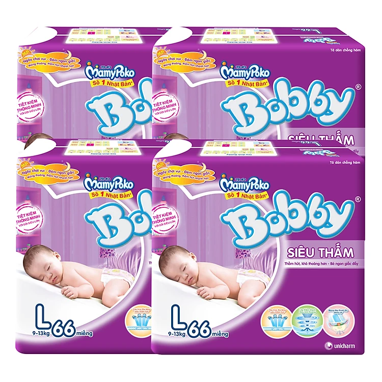 Combo 4 Gói Tã Dán Bobby Fresh Siêu Thấm Gói Cực Đại L66 (66 Miếng)