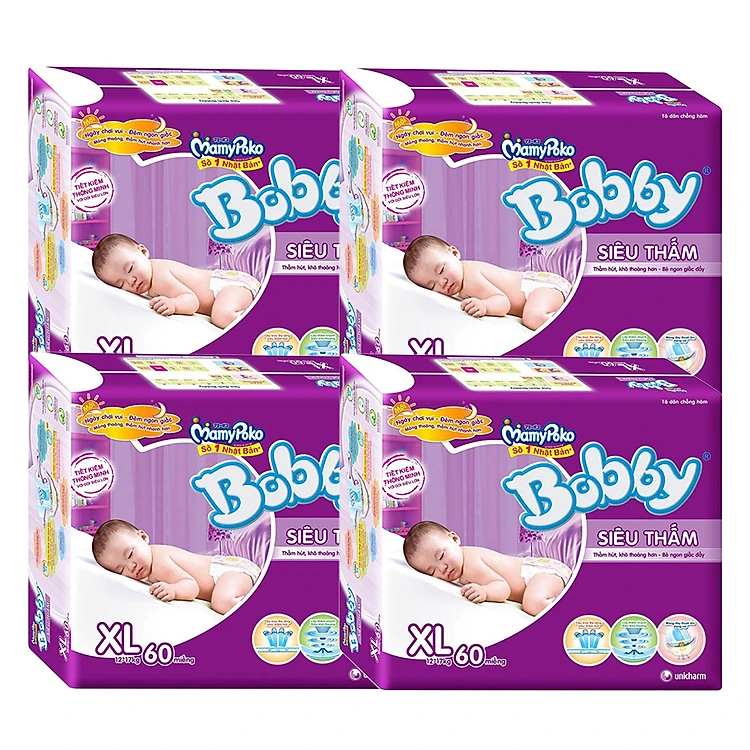 Combo 4 Gói Tã Dán Bobby Fresh Siêu Thấm Gói Cực Đại XL60 (60 Miếng)